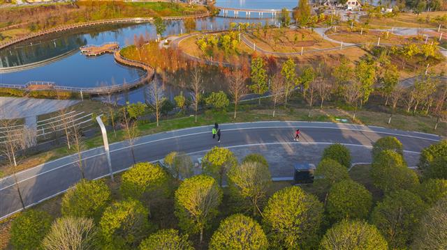 (市民在三合湖公园跑步。资料图  龚长浩 摄)