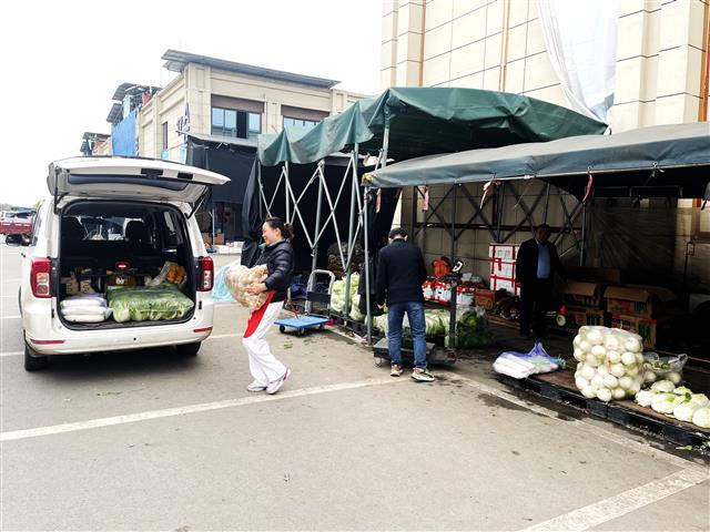 (商户正在搬运蔬菜。记者 谭彬 摄)